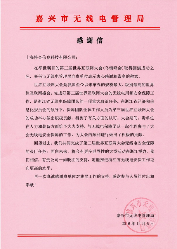 上海特金信息科技有限公司参与会展期间无线电保障工作,得到浙江省经信委以及嘉兴市无线电管理局各位领导的一致好评!