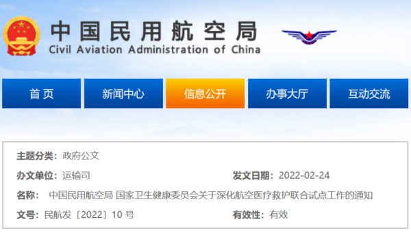 2022年02月24日消息,中国民用航空局和国家卫生健康委员联合发布《关于深化航空医疗救护联合试点工作的通知》(民航发〔2022〕10 号),全国14个省市(天津、山西、辽宁、浙江、安徽、河南、湖南、广东、广西、海南、云南、甘肃、青海、宁夏),将在2024年12月31日前,完善地面保障、畅通空中通道、加大专业培训、制定标准规范、探索发展模式的深化试点任务。