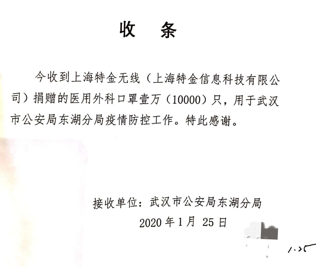 一方有难,八方支援。上海特金紧急筹措的30000只医用口罩已于1月25日正月初一晚上7点20分运抵武汉,并将其中20000只送交到了在此次抗疫中冲锋在前的华中科技大学同济医学院附属协和医院,另将10000只送交到了武汉市公安局东湖分局。