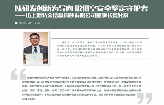 5月,上海特金董事长姜化京先生接受了《中国安全防范技术与应用》杂志专访。作为行业领先的无人机管控和低空安防系统研发制造商的代表人,姜化京先生就低空防御行业的发展与现状等问题回答了记者的提问,并表示特金公司将继续以研发创新为导向,做低空安全坚定守护者。